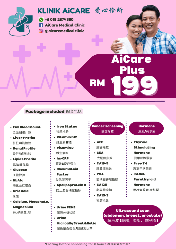 For those looking to take a deeper dive into their health, the AiCARE Plus Health Screening offers even more thorough testing. Along with the essential tests from the Basic and Standard packages, this package adds cancer screening, thyroid function tests, Vitamin B12, and Vitamin D levels. If you’re looking to optimize your health and prevent serious conditions, this package is a must.
